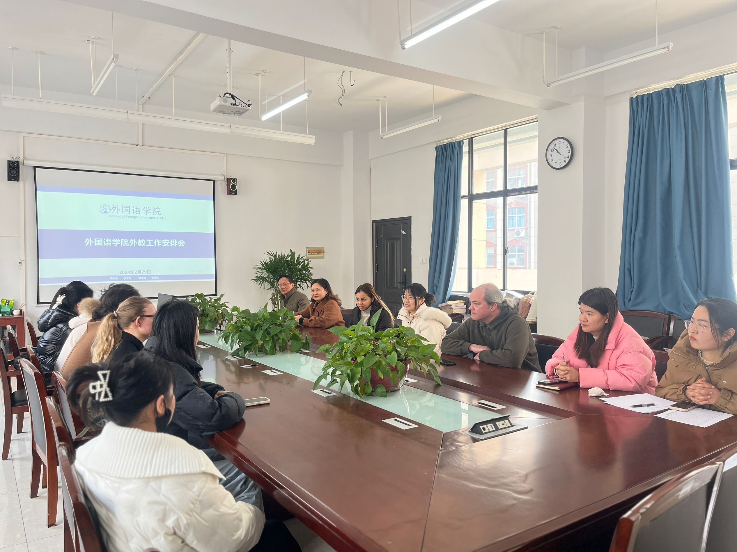 为提升师生国际视野、丰富校园多元文化,本学期国际交流处聘请了四名外籍专家来我校任教。2月29日上午,国际交流处与外国语学院联合召开新聘外教岗前培训会,会议由国际交流处处长郭俊兰主持,外国语学院院长陈勇、副院长王中兰参与会议。