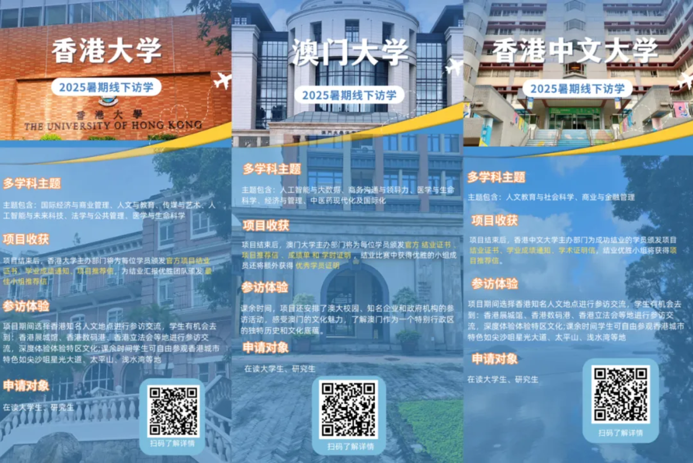 为拓宽学生的国际视野,丰富人生阅历;培养学生的国际化、多元化的文化理念和思维习惯,让学生有机会体验香港和澳门特别行政区的学习生活及社会文化氛围,国际交流处拟组织2025年暑假学生赴港澳短期研学活动,项目结束后,主办单位(香港大学、香港中文大学、澳门大学、英国保诚集团)将为每位学生颁发结业证书、项目推荐信、成绩单和学时证明,结业比赛中获得优胜的小组成员还将额外获得优秀学员证明等。
